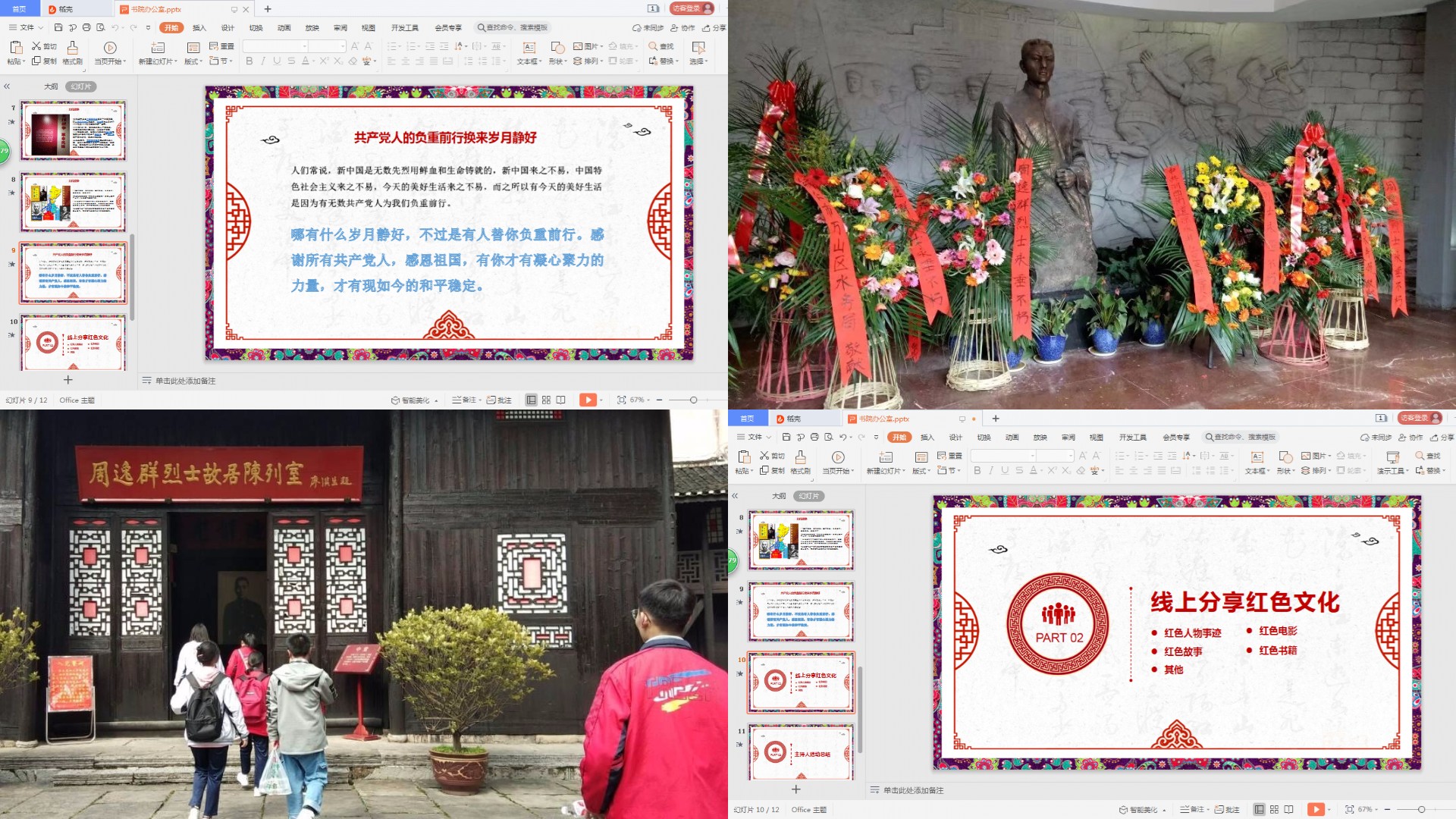活动准备前期,小组成员参观红色人物纪念馆,了解烈士故事,收集红色人物故事、阅读红色书籍、聆听红色音乐并拍照留念,以便在线上活动进行时讲述烈士故事,分享自己的感受与心得,主持人蔡相红制作关于红色文化历史的PPT。活动开始时,姬忠锐致开场词并播放PPT,向小组成员展示红色文化的历史进程,讲述在红色历史进程中对建国大业做出伟大贡献的毛泽东主席、周恩来总理等英雄的故事,各部员闭麦倾听,仔细体会故事背后那浓浓的爱国情意。之后由田小钗同学讲述周逸群烈士的故事并向小组成员展示周逸群烈士的英雄事迹和烈士纪念馆的照片,看着周逸群石塑那坚毅的嫉恶如仇的表情与周围布满的花篮,小组成员都肃然起敬。最后,组内成员依次讲述自己收集到的红色人物事迹和红色故事、书籍、音乐等并交流自己的感受。