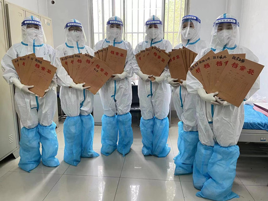 参与者以书信为载体,以“致敬抗疫医护者 青春献礼二十大”为主题,利用绘画、折纸等形式进行艺术创作,丰富书信展现形式,以真挚的情感对医护工作者夜以继日为大家辛苦奉献表达了感谢与感恩,字里行间透露着对医护工作者辛苦工作的致敬,大家攻克艰难、期盼疫情早日结束。作品收集完毕后,负责人将各位同学的作品按照致敬人员对应姓名分装在档案袋中,并专门送到了为学校进行核酸检测的医护工作者手中。医护工作者们在收到同学们的作品后,热情地与装有作品的档案袋拍照留念,向同学们表示感谢。