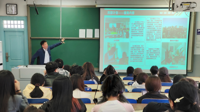 宣讲会上,荣存福老师以“志合者,不以山海为远”为主题,围绕西部计划项目实施背景、保障政策、激励措施、招募选拔流程等多个方面,为在场毕业生进行了全面细致、系统深入的专业解读。他结合感动中国十大人物徐本禹扎根基层、默默奉献的先进事迹,以及往届优秀志愿者扎根西部、坚守初心、奋勇拼搏的奋斗历程,用生动案例展现了西部计划志愿者在基层一线砥砺成长、实干担当的青春风采,让同学们对西部基层的广阔天地有了更加直观真切的认识,进一步坚定了大家投身西部、服务基层、奉献国家的青春志向。